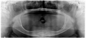 お口の中の診査結果から、とくに下あごの解剖学的状態が入れ歯の吸着を得るためには不利であることがわかりました。また、両側顎関節のCT像からとくに左側顎関節の形態異常を認め、あごの動き方に問題がありました。現状での生活の質(QOL)も70満点中35点とかなり障害されています。患者さんのご要望に応えて入れ歯で機能させるには難症例であることから、最終的な入れ歯を装着する前にリハビリテーション目的で治療用義歯を装着してもらい、これを使用してもらいながら、あごの解剖学的条件の改善と機能の改善を図ることとしました。