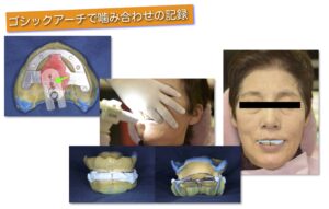 ⑦ 完成した治療用義歯を装着し、調整していきます。あごが左側にズレている(下顎左側偏位)ため、これを是正していく目的で、下あごの入れ歯はわざと奥歯を平坦にして(フラットテーブル)、噛み合わせを丁寧に調整していきます。治療用義歯装着1ヶ月後には、下顎左側偏位が修正されてきました。