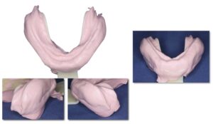 ① 型取りは二回に分けて行います。とくに下あごはその解剖学的条件が悪く、入れ歯が安定するには不利な条件であることから、一回目の型取り(予備印象採得)から丁寧に行います。