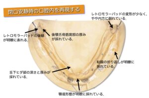 - 頬や舌など柔らかい粘膜組織に接して隙間が封鎖されることによる陰圧作用