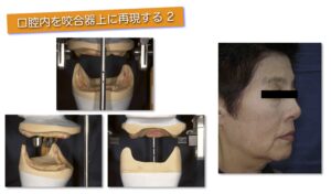 ② 印象採得で製作した上下顎模型を咬合器(お口の動きを再現できる専用の機械)に装着して、お口の状態を咬合器上に再現します。