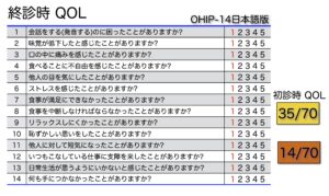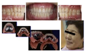 治療用義歯の装着により「よく噛めるようになった」とのお話が聞け、入れ歯の土台となるあごの粘膜が健康になって、下顎左側偏位の修正が得られました。そこで最終義歯(BPS金属床義歯)を製作していくこととしました.製作ステップは治療用義歯製作と変わりません。見た目を綺麗にしたいとのご要望があり、歯肉の相当する部分をカラーリングして、より自然感のある美しい義歯に仕上げました。患者さんの笑顔も見られ、初診時に障害されていた生活の質(QOL)も70満点中14点と全ての項目で向上して、ご満足が得られました。