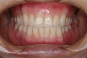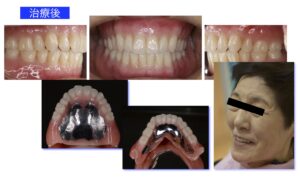 治療後 最初に治療用義歯を装着することにより、傷ついた土台の粘膜の改善と噛み合わせの正常化を図られたことから、最終義歯としてBPS義歯を装着しました。義歯の吸着は良好で、患者さんの生活の質(QOL)は向上し、大変満足いただけました。