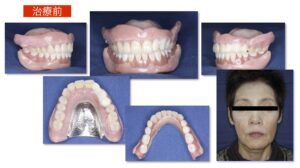 治療前 使用中の上下顎総入れ歯は、修理のつぎはぎ痕が多く存在しています。総入れ歯の土台となるあごの骨の吸収量が多く、また噛み合わせが左にズレていることから、入れ歯が吸着してよく噛めることがは難しい状態でした。