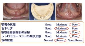 | リスクと副作用 | 下顎側方偏位(左噛み癖)があることから、上顎左側残存顎堤への負担が大きい。上顎フラビーガムが残存していることから、上顎義歯の安定が困難 |